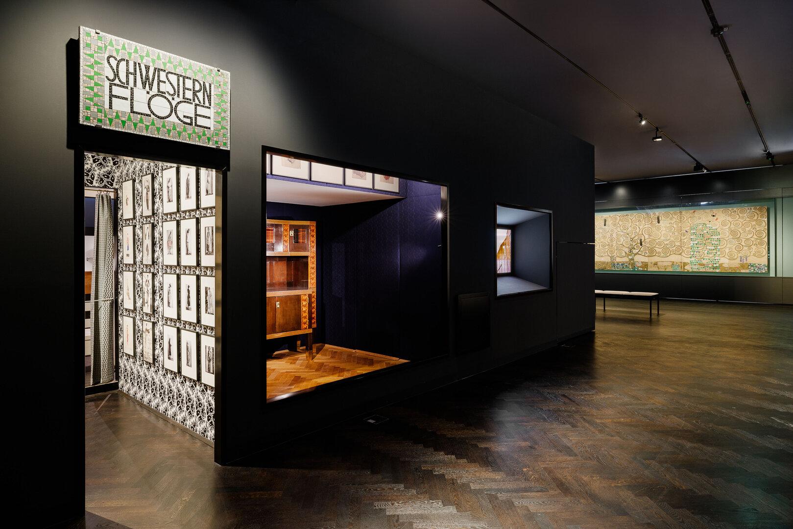Der Schrumpf-Effekt gelingt hier beim Übergang vom Vorraum, dessen Wand die in Wellen geschwungene Fassade des Weltausstellungs-Pavillons von Josef Hoffmann (1925) nachbildet, zur ersten Vitrine. Dort steht eine Holzkassette von Josef Bartoch (1938), die fast genau dieselbe Wellen-Struktur hat, aber nur 18 cm breit ist.
