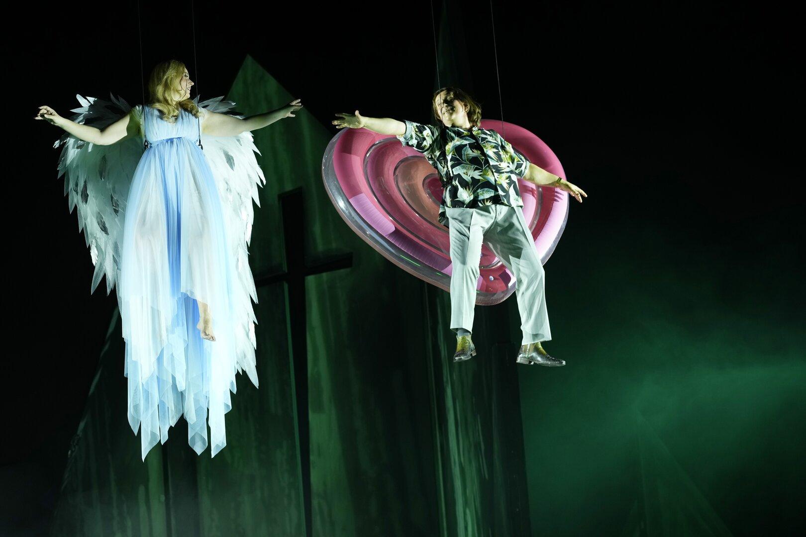 Dunkelheit und Düsternis beherrschen auch Stimmungen der Protagonisten. Nur in der verbotenen Liebesnacht schwebt Katja engelsgleich mit ihrem Geliebten in einem roten Herz empor gemeinsam mit dem anderen Liebespaar, was das Publikum schmunzeln ließ, vielleicht etwas zu kitschig aufgetragen aber wahrscheinlich der einzige glückliche Moment ihres Daseins.