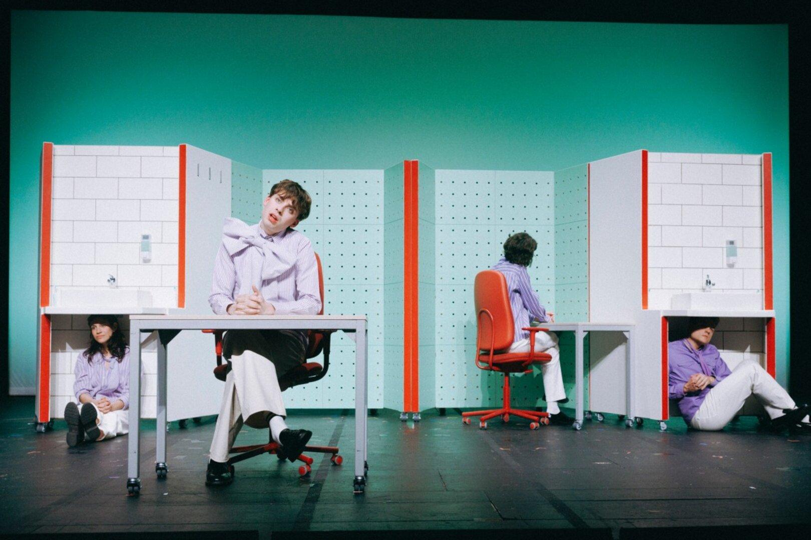 Neben den fantastischen Darstellern glänzen auch Bühne und Kostüm: Andrea Simeon hat alle acht in ähnliche Outfits gesteckt – weiße Jeans mit verschiedenen, aber einander ähnelnden zartlila Oberteilen. Das Bühnenbild: Acht Waschbecken werden flugs zu acht Bürokojen. Auch hier dominieren Pastellfarben, was dem Stück insgesamt den Eindruck einer Fünfziger-Jahre Musical-Komödie verleiht, samt jungen Darstellern, die gemeinsam singen. Diese scheinbare Idylle macht das Geschehene umso schmerzhafter. Sehr, sehr sehenswert!