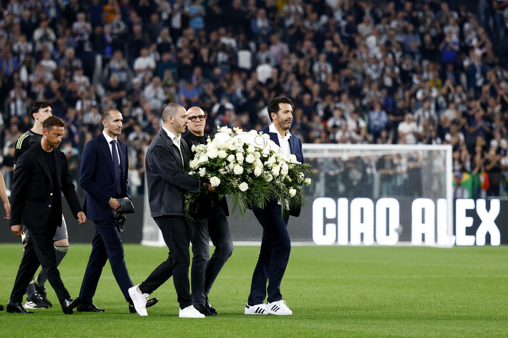 Manningers frühere Juventus-Teamkollegen Gianluigi Buffon, Giorgio Chiellini, Claudio Marchisio und Leonardo Bonucci trugen ein Gebinde aus weißen Blumen auf den Platz und legten dieses vor der Fan-Tribüne ab.