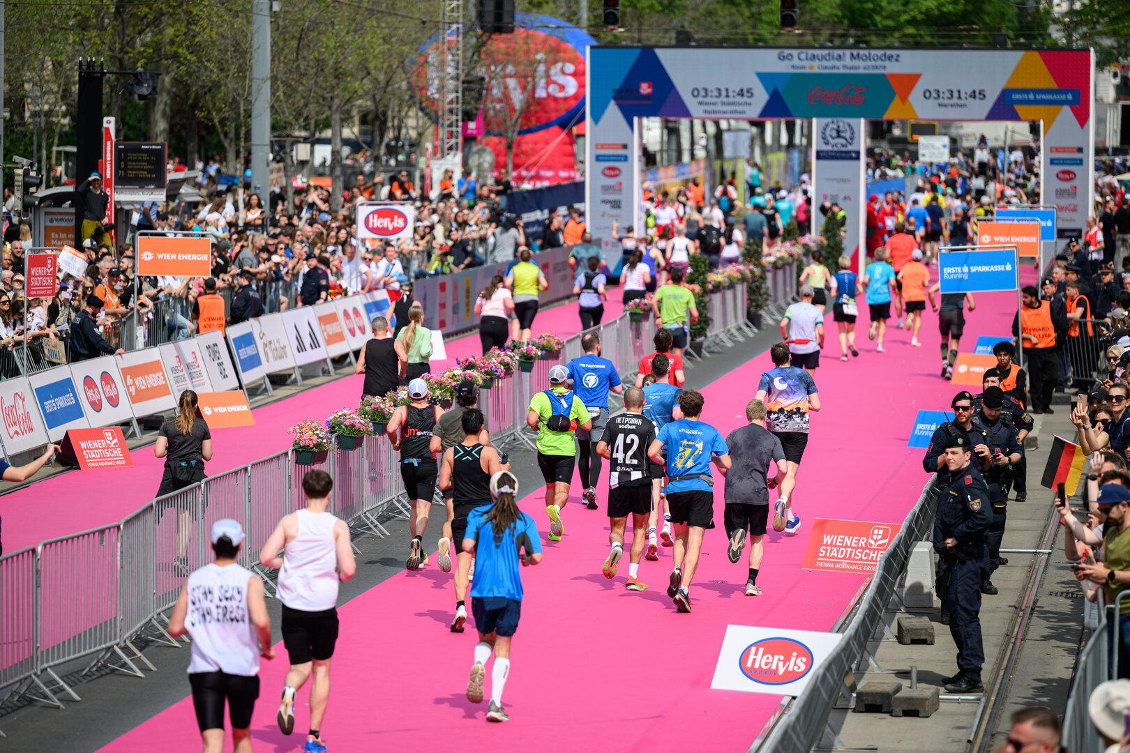 In Wien sind die Dimensionen ganz andere. Diesmal hatte man mit 49.400 Anmeldungen für die diversen Bewerbe am Samstag und Sonntag einen Rekord verzeichnet. Eine neue Höchstmarke an Marathon-Finishern gab es aber nicht. Bei mit 13.000 gleichbleibend vielen Nennungen gab es mit 8.600 Zielankünften deutlich weniger als im Vorjahr mit 9.300. Das lag auch an den warmen Temperaturen, die viele Läufer zur Aufgabe oder zur Streckenhälfte zum frühzeitigen Abzweigen ins Halbmarathonziel veranlassten. Im Halbmarathon wurden 13.000 Finisher gezählt. Glück hatten die Veranstalter mit der anrollenden Regenfront, die, von starken Windböen begleitet, erst am Nachmittag eintraf.